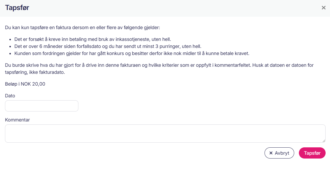 Legg inn dato (vanligvis dagens dato) og en kommentar som begrunner tapsføringen