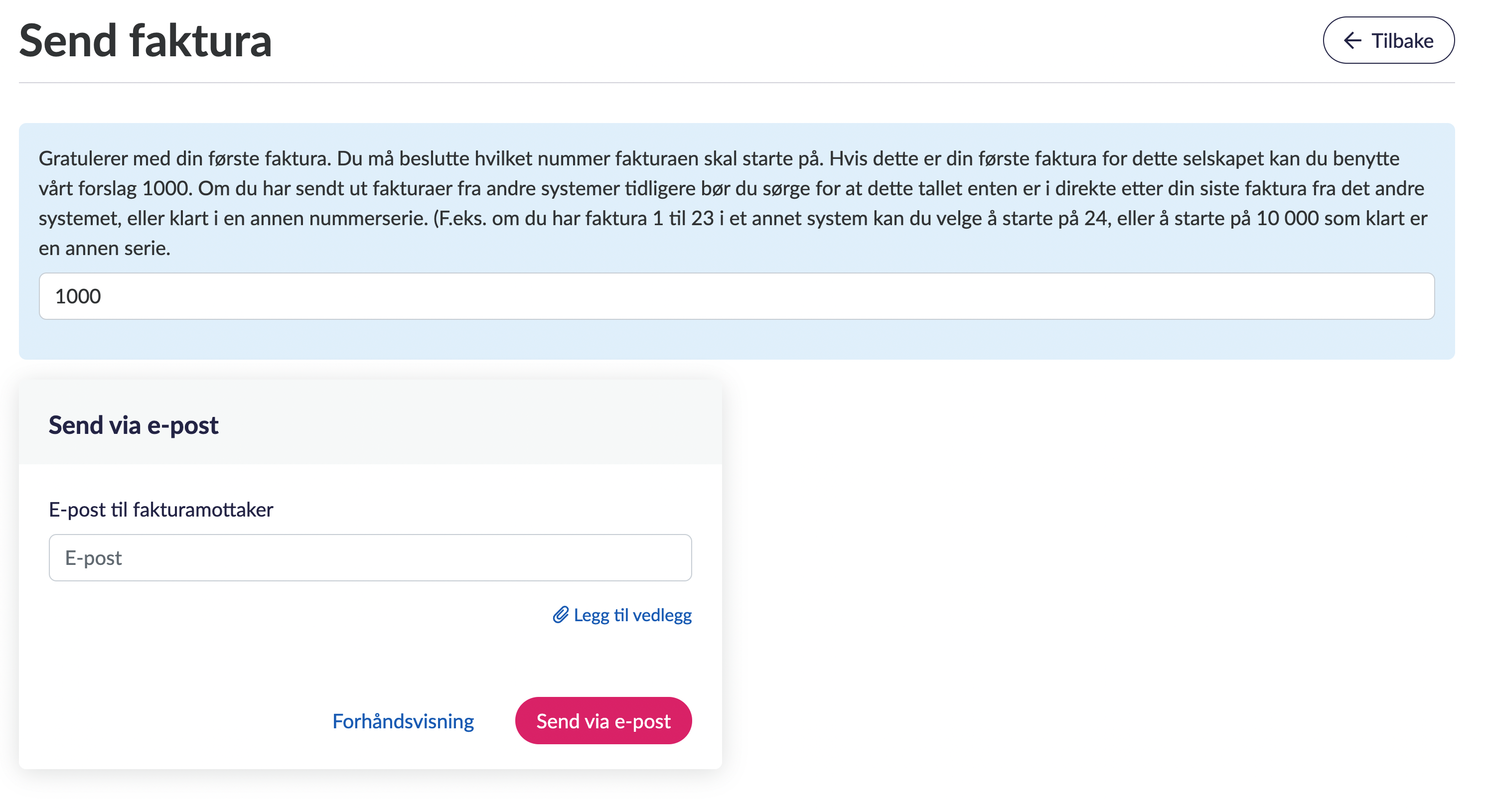 Hvis det har blitt sendt fakturaer fra dette selskapet tidligere, for eksempel gjennom et annet regnskapssystem, bør du sørge for at du fortsetter på den nummereringen som allerede er startet på. For eksempel, hvis du har sendt faktura nummer 1, 2 og 3 fra et annet regnskapssystem, burde du starte med fakturanummer 4. Alternativ, kan du velge å starte i en klart annen nummerserie som for eksempel 10 000.