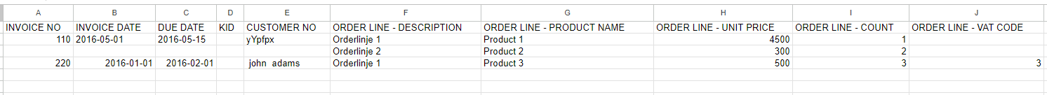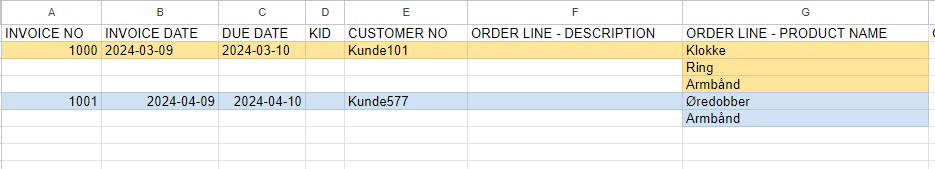 Du vil se at kolonnene A-J er fylt ut med ulike overskrifter. Alle disse er påkrevd å fylle ut, med unntak av kolonne D “KID” og kolonne F “Order line - description” som kan stå tomme.