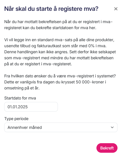 Vanligvis rapporteres mva-meldingen annenhver måned. For bedrifter som har vært mva-registrert i over et år, kan de velge å søke om årlig rapportering om de ønsker det. Har du en bedrift som har endret type mva-periode, må du sette ny type periode: