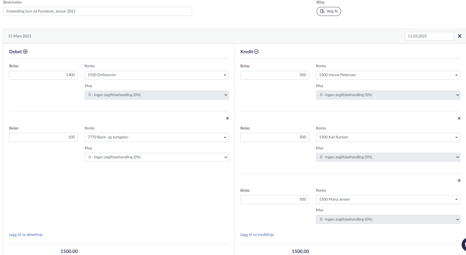 Den enkleste, tryggeste og raskeste metoden hvis du fører ditt eget regnskap. I vårt eksempel med kun 3 deltakere på kurset vil dette være det beste valget. Opprett en vanlig faktura via “Salg” > “Faktura” for hvert salg og send disse til kunden(e). Hvis kundene allerede har betalt fakturaen, kan du sette forfallsdager til 0 dager og legge inn en kommentar som bekrefter at fakturaen allerede er betalt. Legg gjerne også ved informasjon om salget, som f.eks. en kommentar om at kurset ble holdt via Facebook 15.03.2025.