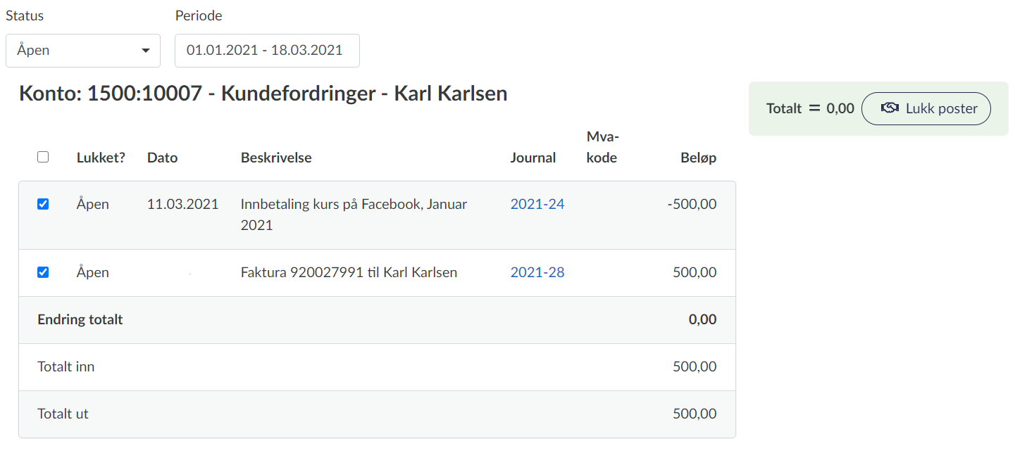 Når du har registrert refusjonen og tilbakebetalingen, kan du lukke disse postene mot hverandre i betalingsoversikten for denne kunden (se litt lengre opp for en beskrivelse).