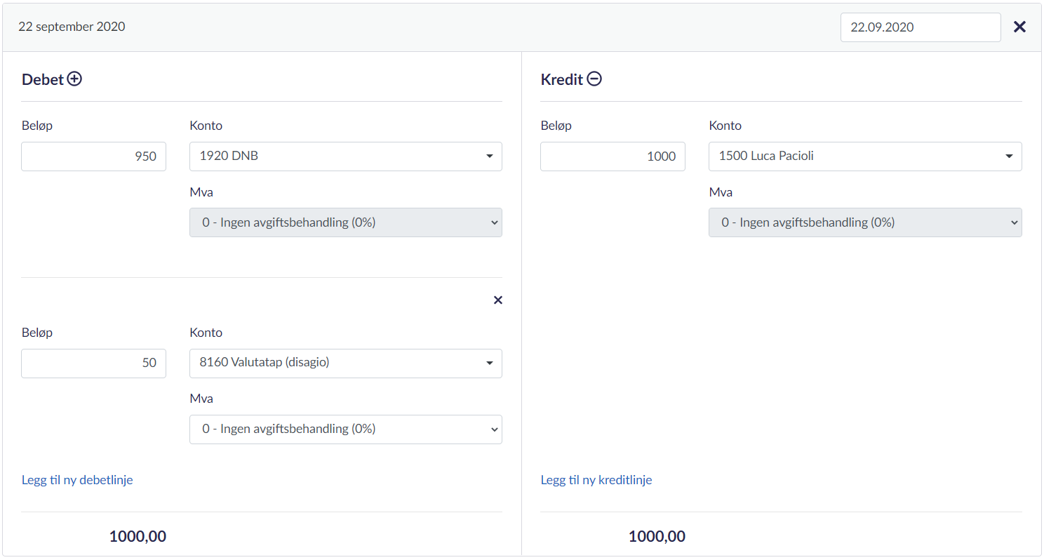 I noen tilfeller vil banken din trekke et gebyr på innbetalinger fra utlandet. Dette må du føre inn sammen med betalingen i et manuelt bilag. Eventuelle bankgebyrer skal da føres på debet-siden (+) på konto 7770 bank- og kortgebyr.