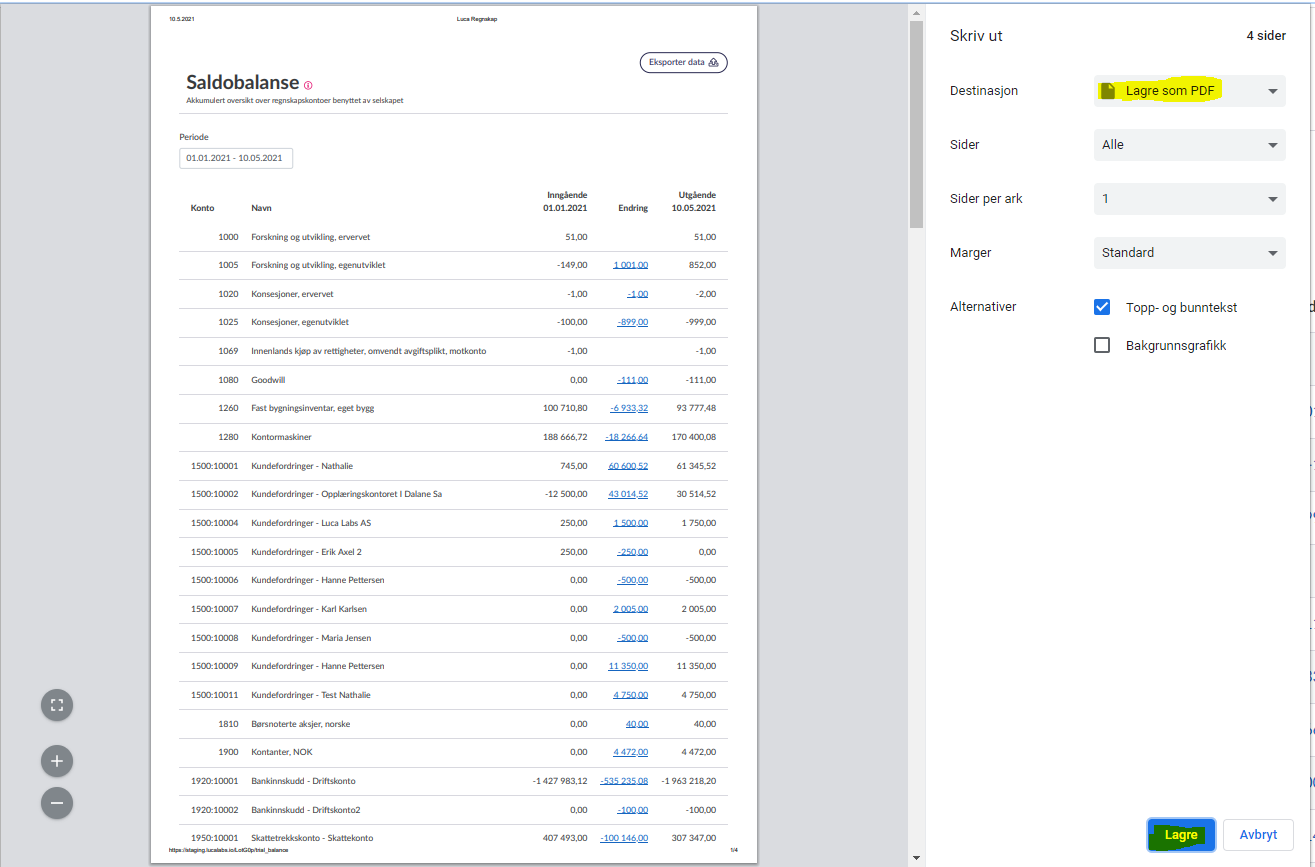 Du kan likevel bruke nettleseren din til å få en regnskapsrapport i PDF-format. Husk å først filtrere på perioden du ønsker skal vises.