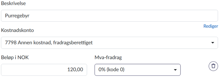 Før purregebyret mot konto 7798. Husk at hvis ikke annet er spesifisert på kvitteringen, skal du ikke føre mva-fradrag på purregebyret.