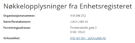 - Virksomhetsnummer : Dette er ikke det samme som organisasjonsnummeret. Du finner virksomhetsnummeret ditt i Brønnøysundregistrene ved å gå til brreg.no > søk opp selskapet ditt > klikk på «oversikt over registrerte virksomheter» > Legg inn nummeret som vises til høyre for «Virksomhet». Du kan også komme direkte til siden ved å klikke på “Finn nummeret hos Brreg”Du kan kun ha ett virksomhetsnummer per selskap.