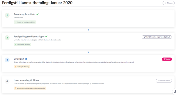 Nå er det tid for å overføre pengene til de ansatte og skatten til skattetrekkskontoen. Hvis du har bankintegrasjon med betalingsintegrasjon kan du sende betalingen rett fra regnskapet til nettbanken. Betalinger som allerede er gjort fra nettbanken må registreres som “Allerede betalt”.