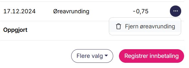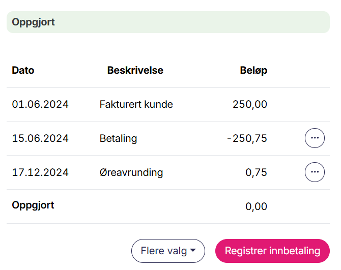 Fakturaen endrer status til oppgjort, og du vil se en ny linje Øreavrunding.