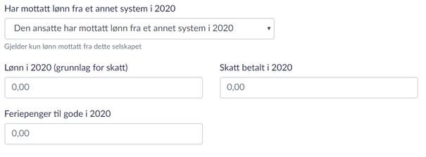 Har mottatt lønn fra et annet system i 2026 : Her kan du enten velge «Den ansatte har ikke mottatt lønn fra et annet lønnssystem i 2026» eller «Den ansatte har mottatt lønn fra et annet system i 2026».