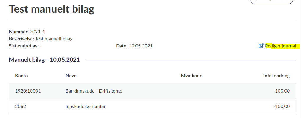 Manuelle bilag kan redigeres fritt så lenge du ikke har noen regnskapslåser som hindrer deg fra å gjøre dette.