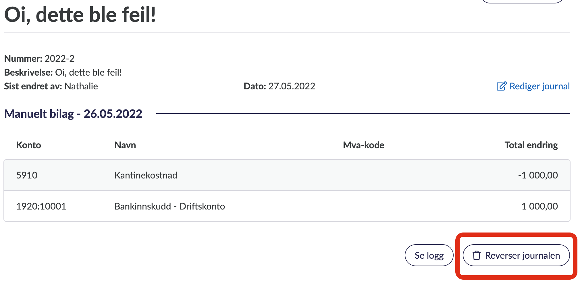 Nå opprettes det en ny postering i journalen med samme dato som den forrige, men selve posteringen har motsatt debet og kredit. Det betyr at det manuelle bilaget nå er “nullet ut” siden det nå går i null.