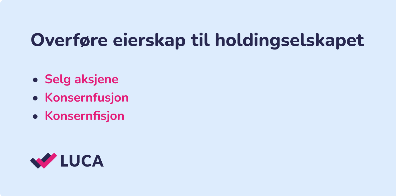 Da slipper du å måtte overføre aksjene eller sysle med konsernfusjon og konsernfisjon i etterkant. Slikt kan koste penger og tid, noe du unngår ved å etablere morselskapet først.