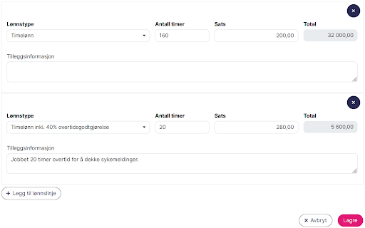 Hvor mye den ansatte har jobbet overtid skal dette legges til sammen med timeregistreringen. For eksempel har den ansatte jobbet 20 timer overtid denne måneden. Altså tilsammen 180 timer totalt. Da skal først de 160 timene legges til som vanlig lønn. Så skal overtidstimene legges til ved å trykke “+ legg til lønnslinje”. Her velger du avtalt tilleggssats fra lønnstype menyen og fyller ut at den ansatte har jobbet 20 timer overtid med tilsvarende sats for timelønn. Fyll gjerne ut i kommentarfeltet hva dette gjelder slik at du har bedre orden på det i etterkant.