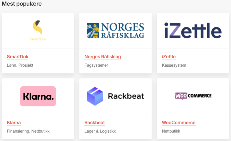 Som vi nevnte innledningsvis kan PowerOffice Go integreres med veldig mange eksterne tjenester og program. Totalt er det over 300 integrasjoner som er tilgjengelig, i en rekke ulike kategorier.
