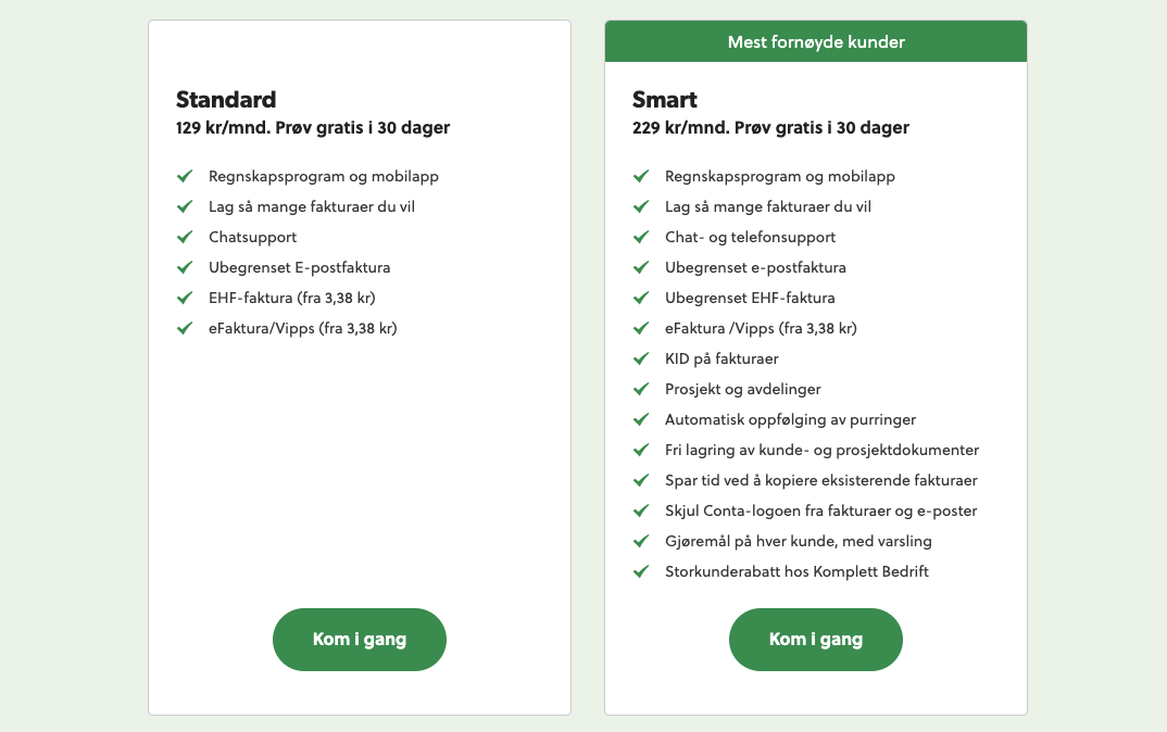 - Standard – Du kan føre enkelt regnskap, sende og motta faktura, og du får tilgang til kundestøtte
