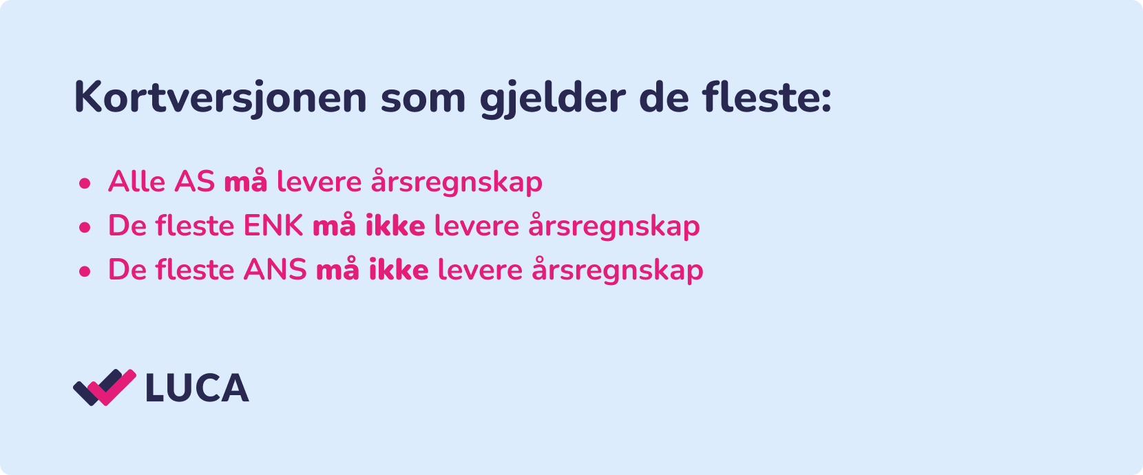 Hvis du bruker Luca Regnskap kan du legge til en egen modul for årsregnskap (egen versjon for AS og egen versjon for ENK), og da vil systemet opprette årsregnskapet automatisk når du avslutter året. Innleveringen gjør du også direkte fra regnskapsprogrammet, og du slipper å taste inn tallene manuelt i Altinn.